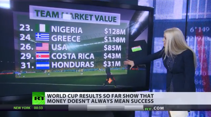 Noget af det interessante ved VM – i modsætning til international klubfodbold – er at de “fattige” hold også kan gøre sig gældende. USA har naturligvis ikke et fattigt forbund, men når man kigger på markedsværdierne af spillerne tegner der sig et interessant billede. Mange af de dyre hold er allerede slået ud – og flere er tæt på – mens flere hold i bunden af listen har spillet sig videre til finalerne. Det vil være sjovt hvis hold som Colombia og Costa Rica kan spille sig helt frem til semi-finalerne.